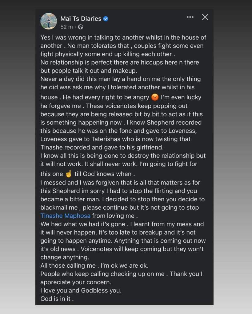 While the drama unfolded, audios allegedly recorded by Tinashe surfaced of Mai TT crying after a misunderstanding. It is alleged that Tinashe recorded and sent audio to a friend who later leaked the audios.