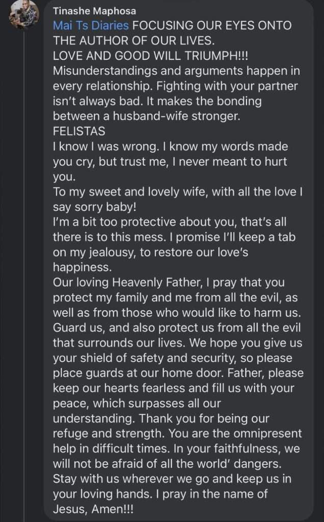 Relationships have ups and downs and only the strong-willed win. Come Sunday the 28th of November, video clips started trending of Felistas and Tinashe getting married. It’s not easy being a public figure as people are always interested on everything. Celebrities are always encouraged to keep their private affairs private but it’s not easy. Even though Mai TT bragged that she gets paid on Facebook but as a human being it gets tough. Sometimes, all pain is written all-over our faces no matter how we pretend to be fine.