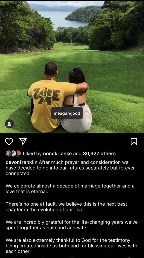 Meagan Good and her husband set to divorce after 9 years of marriage. Devon Franklin took to Instagram to announce the sad divorce news.