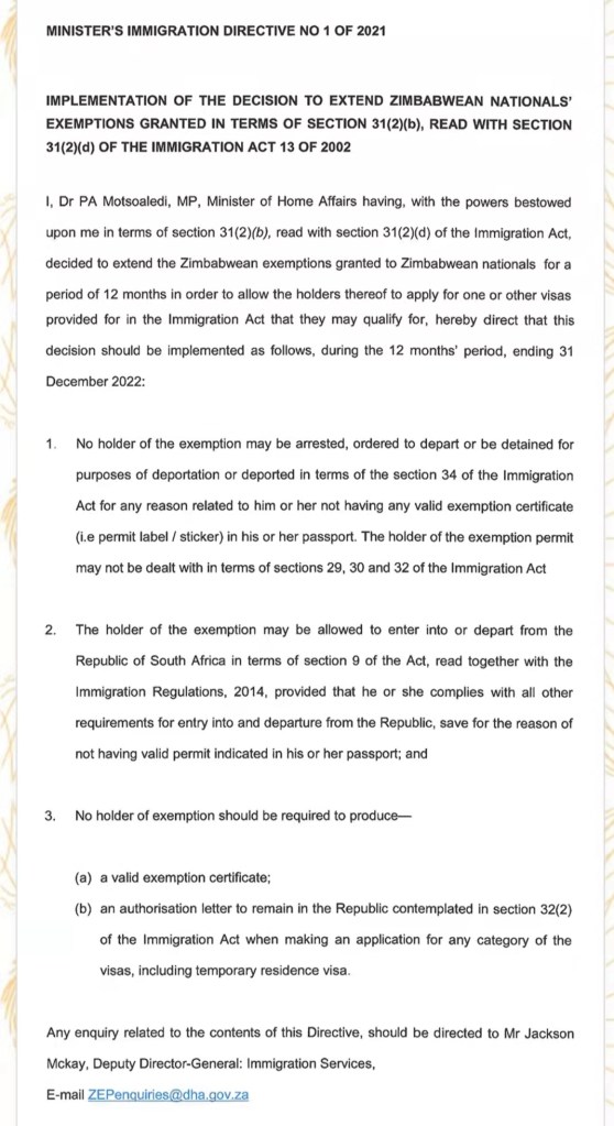 Home Affairs minister Aaron Motsoaledi has extended exemption permits to Zimbabwean nationals for a period of twelve months to allow holders to apply for a necessary visa under the Immigration Act.