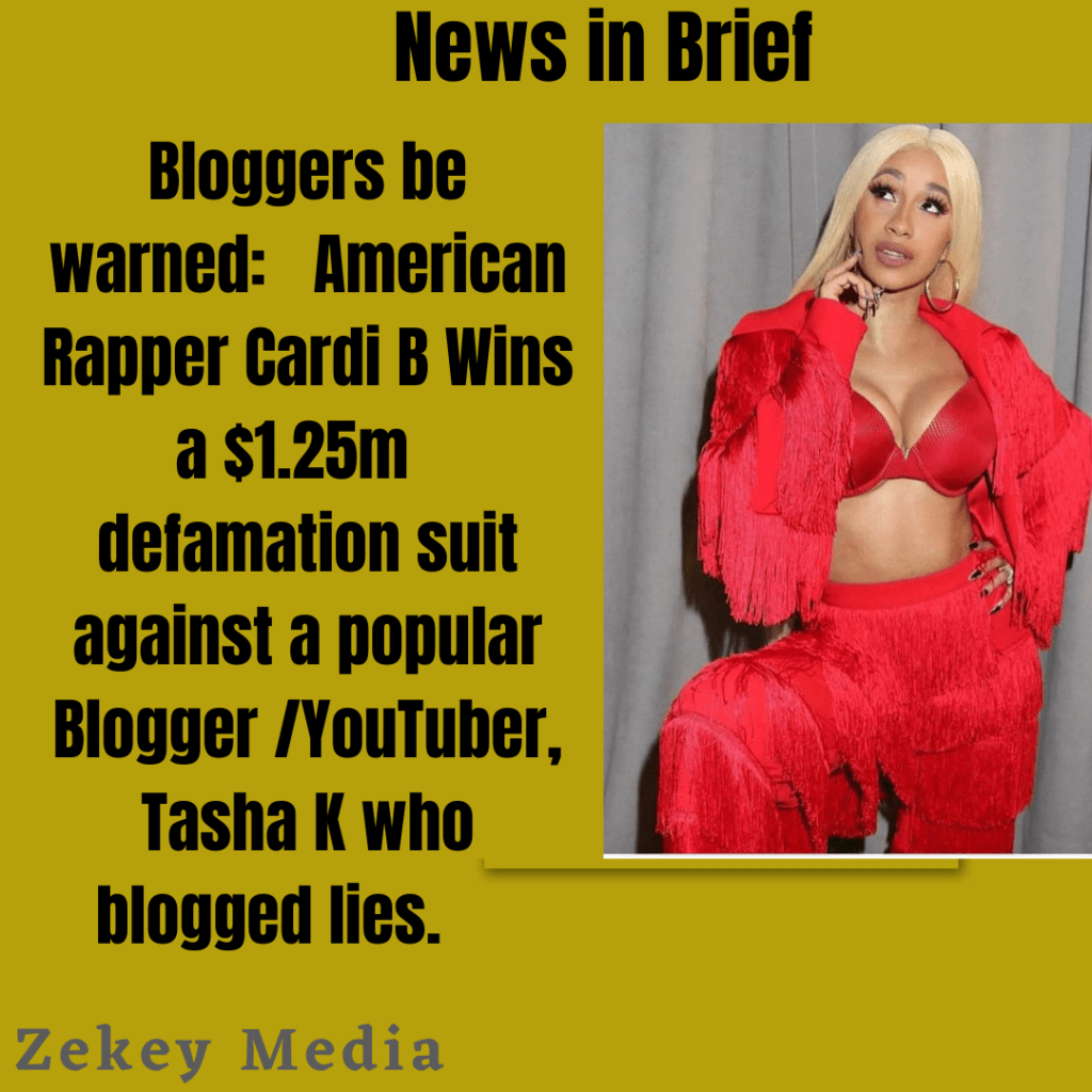 Rapper, Cardi B has won her defamation lawsuit against gossip blogger and YouTuber, Latasha Kebe, publicly known as Tasha K, and has been awarded $1.25 million in damages.