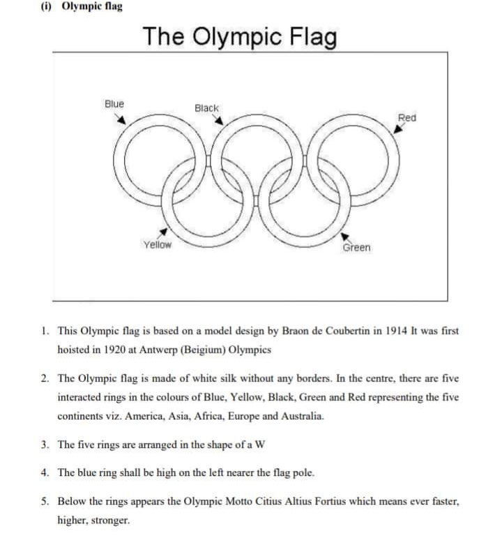 “The Olympic flag has a white background, with five interlaced rings in the centre: blue, yellow, black, green and red. This design is symbolic; it represents the five continents of the world, united by Olympism, while the six colours are those that appear on all the national flags of the world at the present time.”