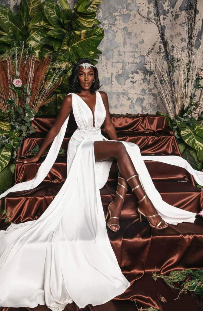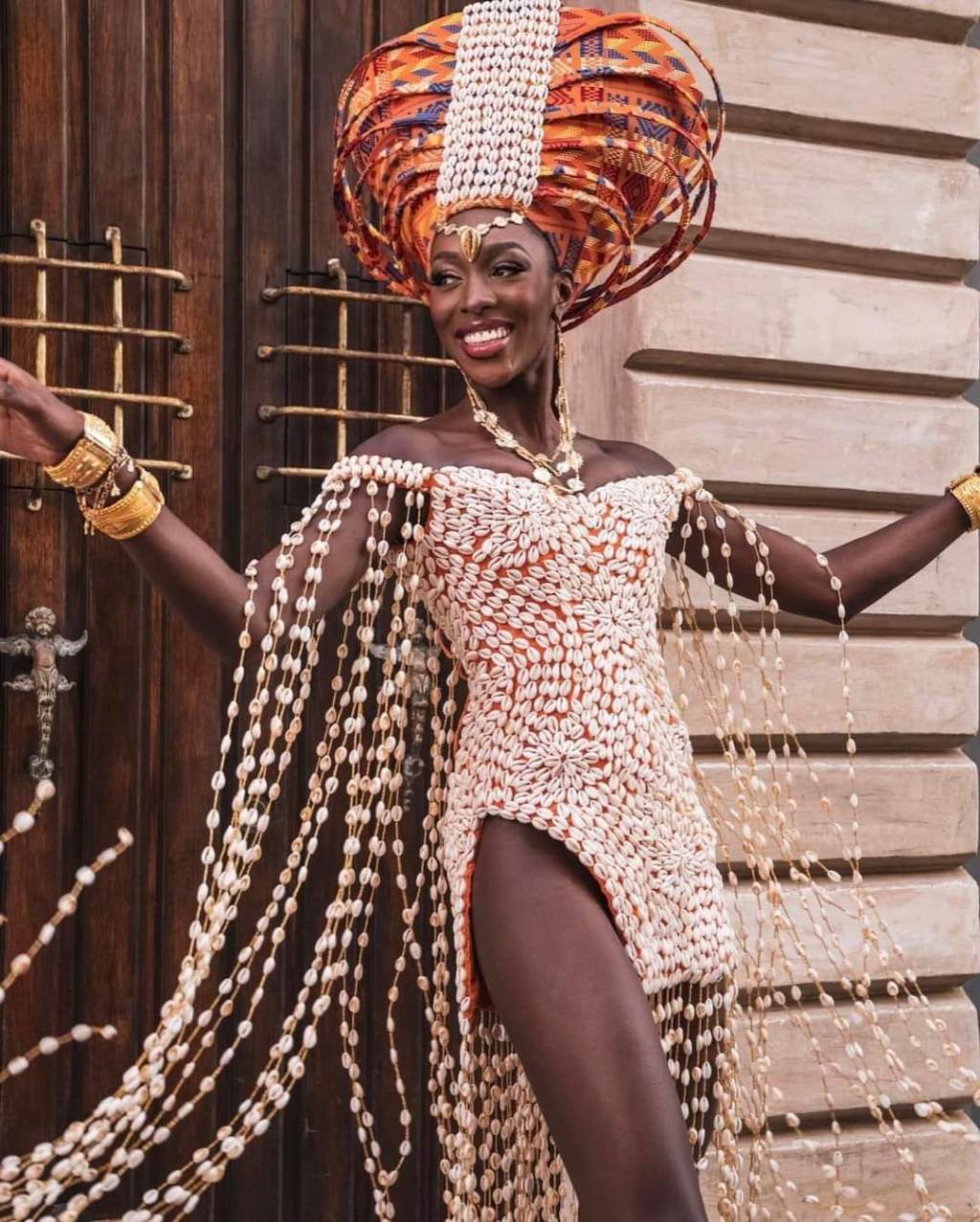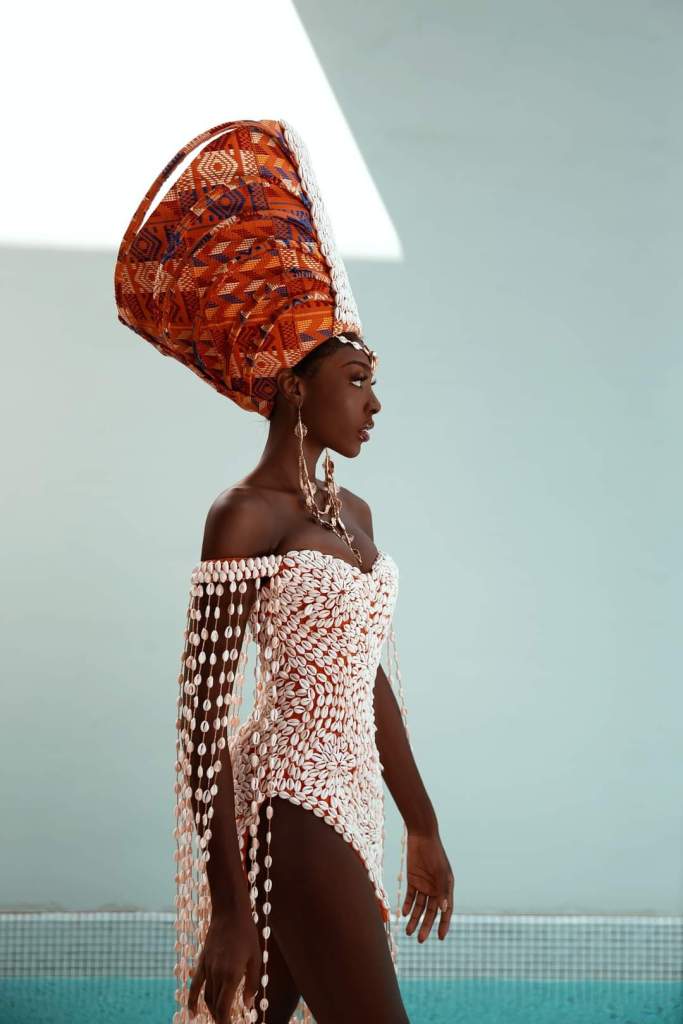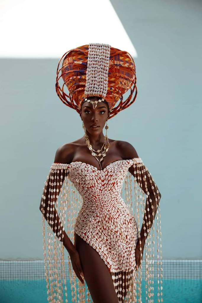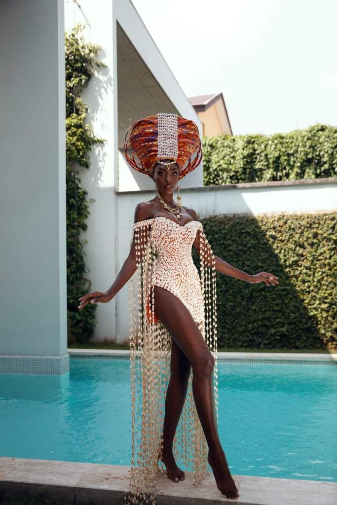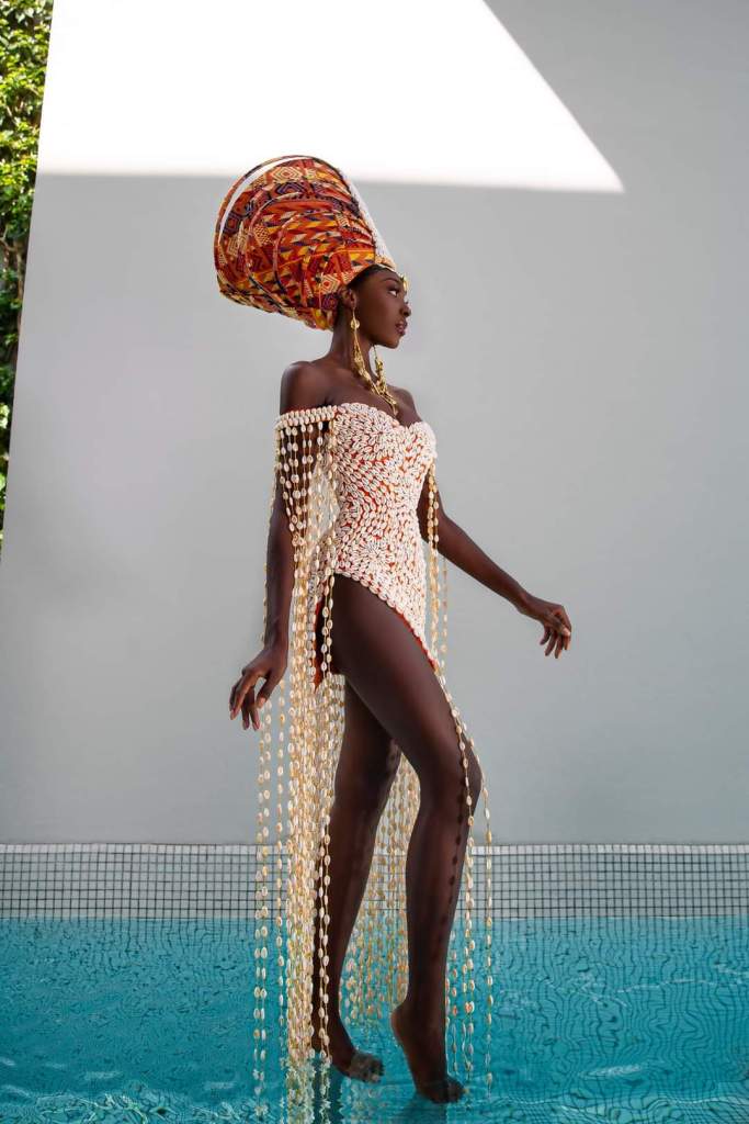 “The cowrie shells that make up the centre piece come from the ocean and symbolize creation, life, and protection. They are interlaced and run all along the body to portray the beautiful waves and waterfalls of Cote d’Ivoire. The headdress represents a calabash full of water that the AKAN woman carries on her head as she returns from the river. It is a source of life, and it symbolizes hard work. The orange stripe of the Ivorian orange-white-green flag expresses the splendour of national blossoming,” Olivia Yace added.
