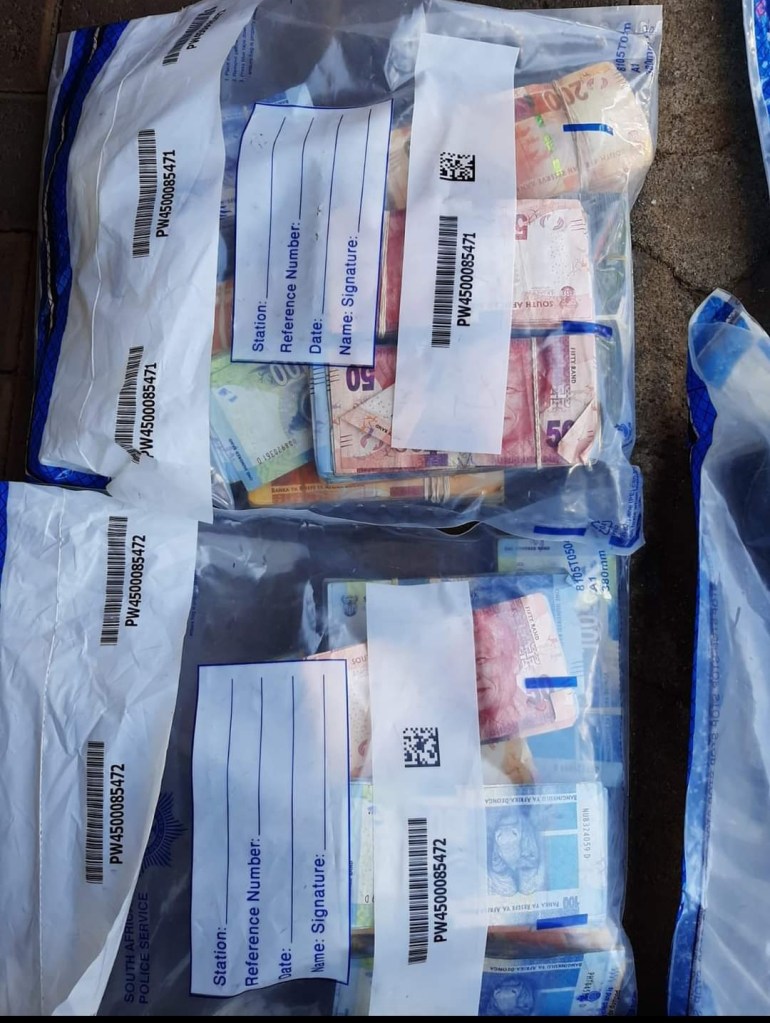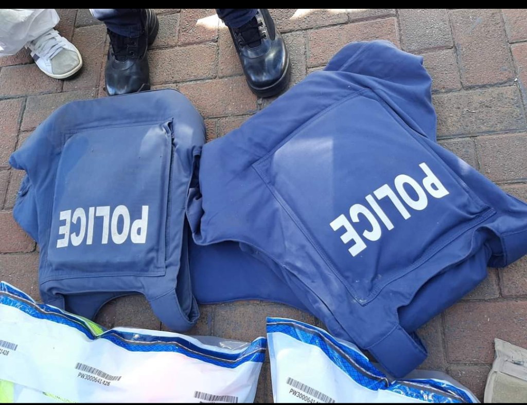 The police found and seized three vehicles which were positively identified as hijacked, two more vehicles with tempered engine numbers, a 9mm pistol with ammunition, an R5 rifle with ammunition, a gas pistol, one blue light, Metro Police reflector jackets, SAPS bullet proof vests, siren speaker, a jammer and cash.