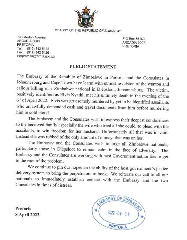 The Embassy of the Republic of Zimbabwe in Pretoria and the Consulates in Johannesburg and Cape Town have lean’t with utmost revulsion of the wanton and callous killing of a Zimbabwe national in Diepsloot, Johannesburg. The victim, positively identified as Elvis Nyathi, met his untimely death in the evening of the 6th of April 2022. Elvis was gruesomely murdered by yet to be identified assailants who unlawfully demanded cash and travel documents from him before murdering him in cold blood.