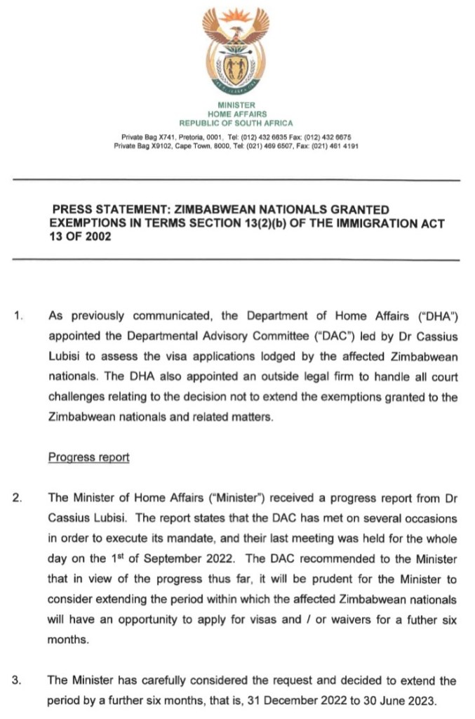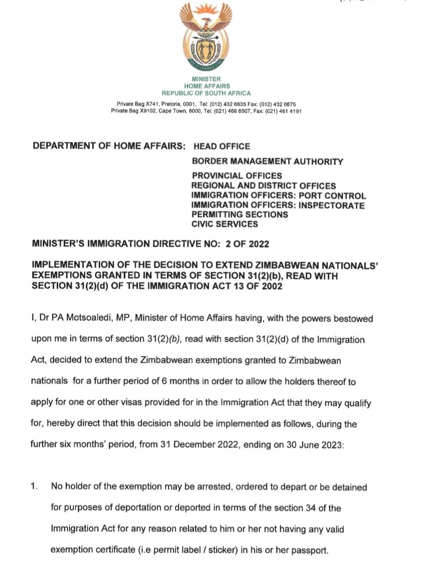 The department says the minister remains committed to affording affected Zimbabweans nationals another opportunity to apply for visas or waivers.