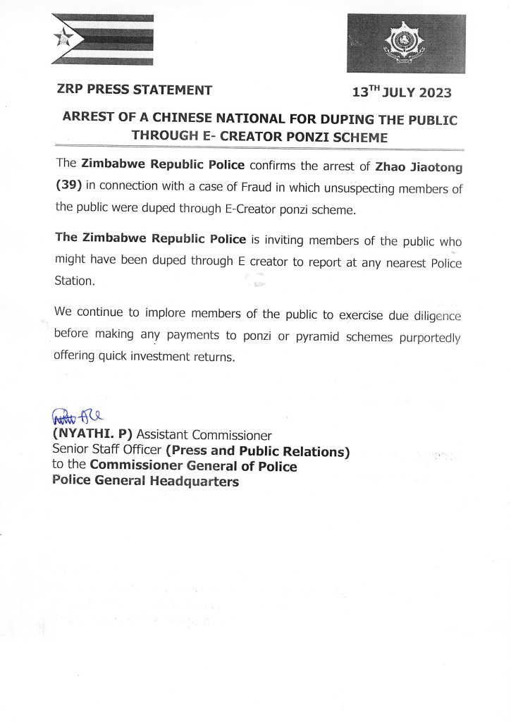 The Zimbabwe Republic Police confirms the arrest of Zhao Jiaotong(39) in connection with a case of Fraud in which unsuspecting members of the public were duped through E-Creator ponzi scheme.