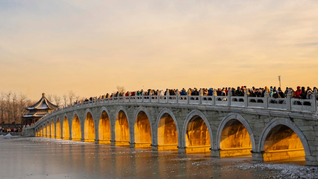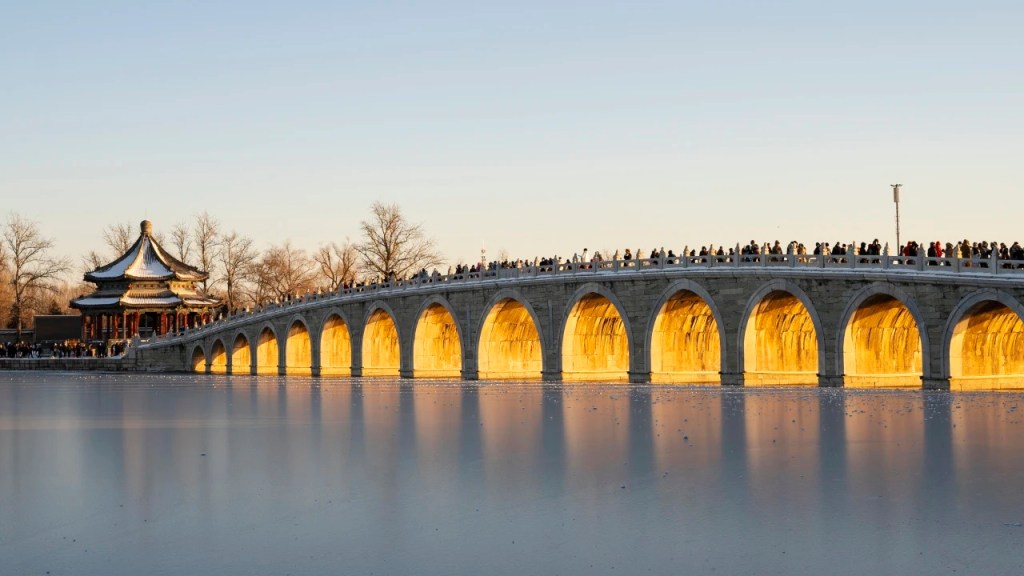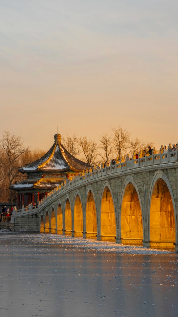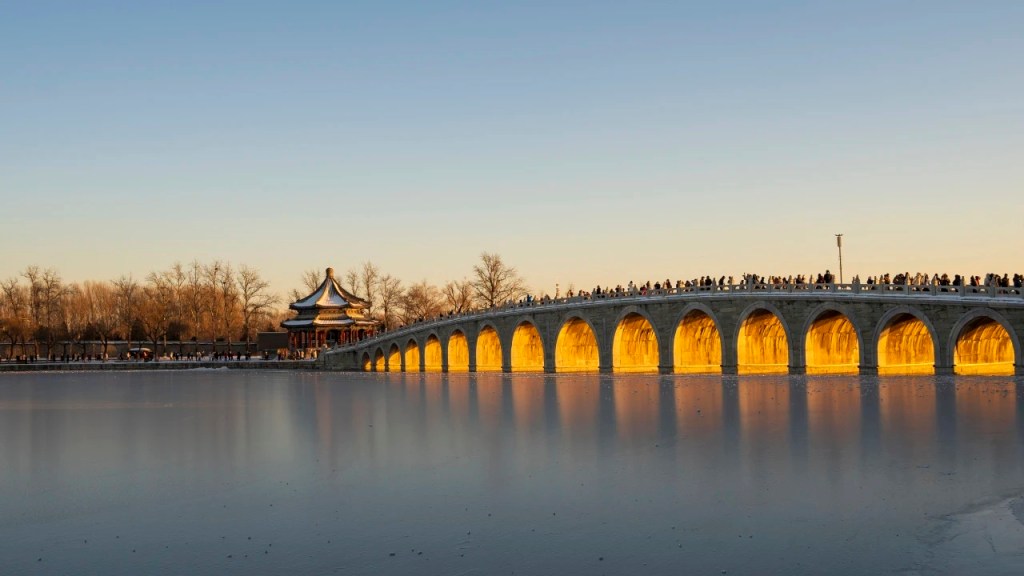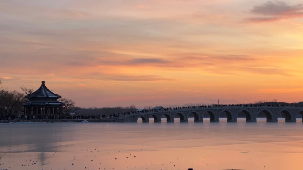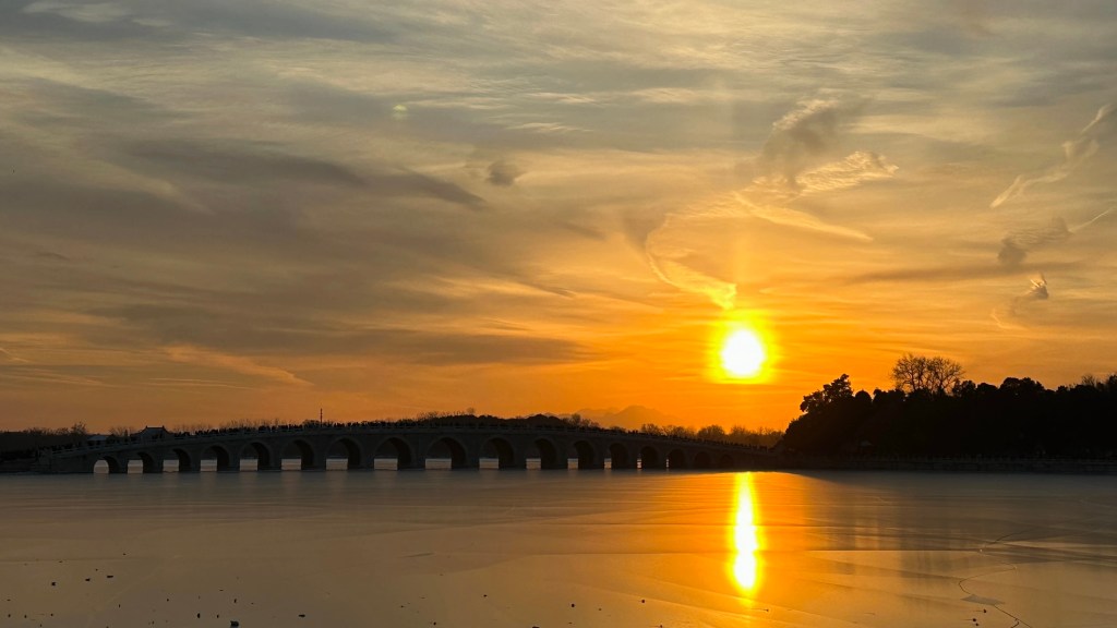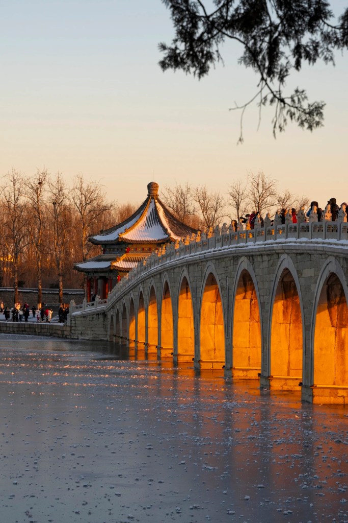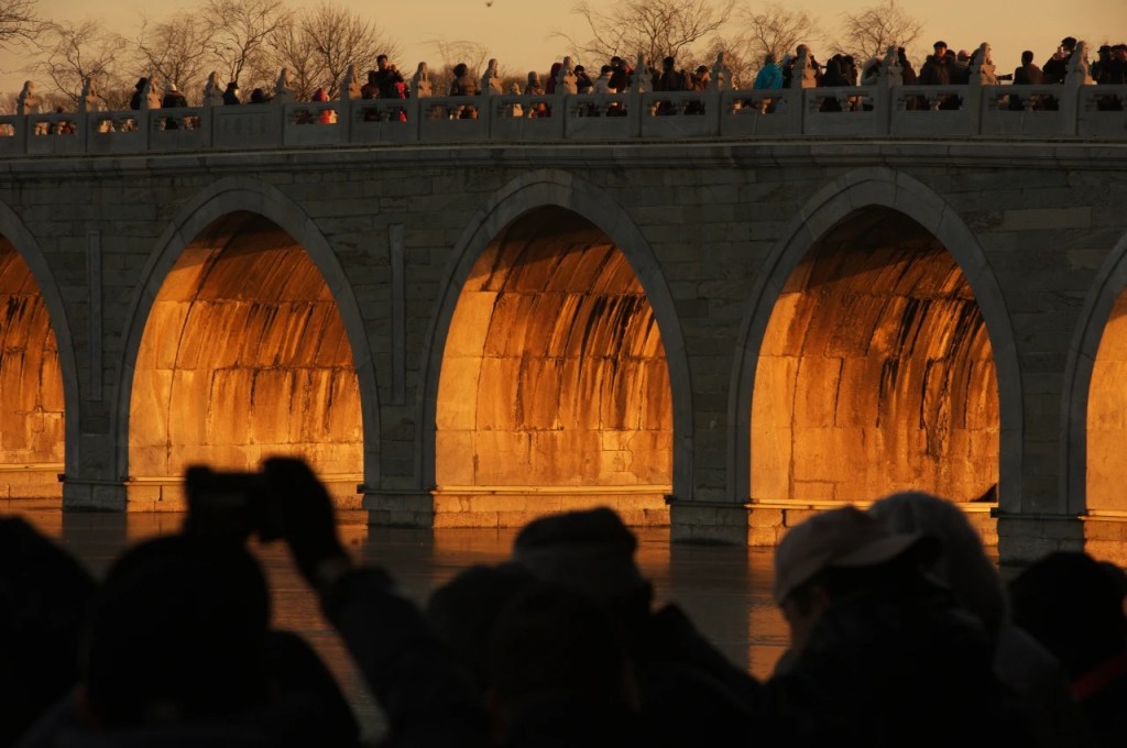 Every year around the winter solstice, the setting sun passes through the Seventeen-hole Bridge on Kunming Lake in the Summer Palace, illuminating all seventeen bridge holes, presenting a magnificent landscape, commonly known as the “golden light hole”. Four o’clock in the afternoon is the best time to observe the beautiful scenery, attracting countless tourists to take pictures.